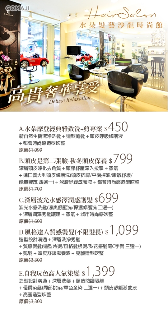 只要450元起,即可享有【水朵髮藝沙龍時尚館】A.水朵摩登經典雅致洗+剪專案 / B.頭皮是第二張臉-秋冬頭皮保養 / C.深層波光水感澤潤感護髮 / D.風格達人質感燙髮(不限髮長) / E.自我玩色高人氣染髮GOMAJI夠麻吉有折扣可以使用,它應該是目前最優惠的,